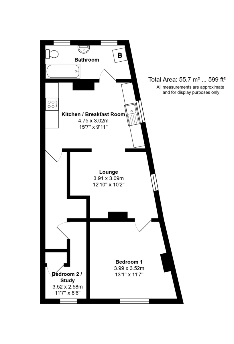 Located at the end of the terrace this first floor apartment has well-proportioned rooms with a light and airy feel and 599 sq ft of living space comprising: hallway, 15’ kitchen/breakfast room with door to bathroom, from the kitchen is an archway leading to 12’ lounge with door to 13’ bedroom, from the hallway is a door to bedroom 2 (which is currently being used as a study). Ideally situated for local amenities, bus routes and commutable road links and offered with gas fired central heating, double glazing and no forward chain, viewing is strongly recommended in order to appreciate both accommodation and location on offer.