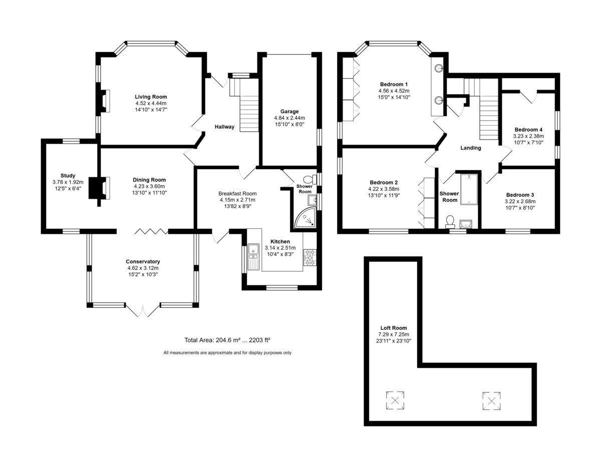 LOFT SPACE 23' 11" decreasing to 7'5" x 23' 10" decreasing to 7'8" (7.29m x 7.26m) L shaped, measurements taken from approximately 3'5" off floor level with eaves to front and side, maximum central ceiling height 7'1", fully boarded and carpeted, accessed via hatch and extendable ladder from landing, two skylight windows to rear aspect with blinds, access to further loft storage space.
