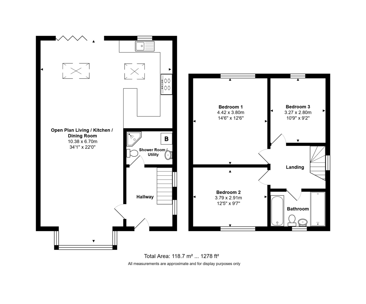 A newly built three bedroom family home that has the advantage of a low maintenance wrap around garden. The accommodation comprises: hallway, utility/shower room, 34’ open plan living room inc. dining area to one end with bi-folding doors leading onto a raised decked rear garden and opening onto a fully fitted kitchen including appliances.
